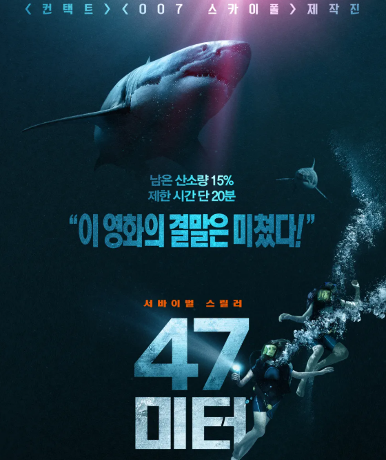 산소보다 먼저 찾아오는 공포가 존재합니다. 그것은 폐로 들어오기 전에 우리의 이성을 마비시키고, 감각을 뒤흔드는 존재입니다. 2017년 여름 극장가를 뜨겁게 달군 요하네스 로버츠 감독님의 영화 <47미터>는 심해 공포와 상어 스릴러의 매력을 동시에 담아내며 관객들에게 숨 막히는 경험을 선사했습니다. 특히, 수십 미터 아래 바닥으로 추락한 상어 케이지 안에 갇힌 두 자매의 생존 사투는 단순한 오락 영화를 넘어 극한의 폐쇄 공포와 심리적 압박감을 여실히 보여줍니다. 탁 트인 바다 밑 어둠 속에서 펼쳐지는 예상치 못한 전개와 반전은 관객들로 하여금 영화가 끝날 때까지 한순간도 긴장의 끈을 놓을 수 없게 만듭니다. 지금부터 <47미터>가 어떻게 깊고 어두운 심해 속으로 관객을 초대하여 공포의 한가운데로 몰아넣었는지 함께 살펴보겠습니다.