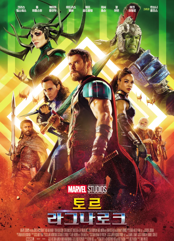 2017년 개봉한 <토르: 라그나로크>(Thor: Ragnarok)는 마블 시네마틱 유니버스(MCU)의 토르 시리즈 세 번째 작품이자, 페이즈 3의 다섯 번째 영화입니다. 이 영화는 이전 토르 시리즈가 보여주었던 진지하고 다소 무거운 분위기에서 벗어나, 타이카 와이티티 감독 특유의 유머와 독창적인 비주얼, 그리고 신선한 연출로 시리즈에 새로운 활력을 불어넣으며 평단과 관객 모두에게 뜨거운 호평을 받았습니다. 특히, 오프닝부터 라그나로크를 예언하는 수르트를 상대로 농담을 던지는 토르의 모습은 이 영화가 이전과는 완전히 다른 톤을 지향하고 있음을 명확히 보여줍니다. 어둡고 비극적인 종말을 의미하는 '라그나로크'라는 소재를 다루면서도, 이를 코믹하고 경쾌한 방식으로 풀어내어 슈퍼히어로 영화의 새로운 지평을 열었다는 평가를 받고 있습니다. 단순히 액션과 스케일에 집중하기보다는, 캐릭터들 간의 유쾌한 상호작용과 예측 불가능한 전개로 관객들에게 신선한 재미와 깊은 인상을 남긴 작품입니다.