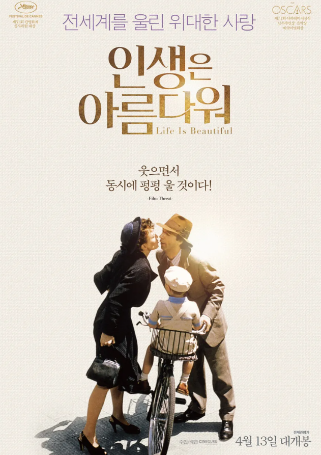 영화 <인생은 아름다워>(La vita è bella)는 1997년에 제작된 이탈리아 영화입니다. 감독, 각본, 주연을 모두 로베르토 베니니가 맡았습니다. 제2차 세계대전을 배경으로, 이탈리아 토스카나에 사는 유대인 가족이 겪는 비극을 다루지만, 이를 로베르토 베니니 특유의 유머와 상상력으로 승화시킨 작품입니다. 장르는 코미디, 드라마, 로맨스, 전쟁 등 다양하게 분류될 수 있으며, 비극적인 현실 속에서 희극적인 요소를 찾는 '트래지코미디'의 정수를 보여줍니다. 주요 출연진으로는 주인공 귀도 역에 로베르토 베니니, 그의 아내 도라 역에 니콜레타 브라스키(로베르토 베니니의 실제 아내), 아들 조수아 역에 조르지오 칸타리니가 출연했습니다. 영화는 크게 두 부분으로 나뉘는데, 전반부는 귀도와 도라의 유쾌하고 로맨틱한 만남과 결혼 생활을, 후반부는 그들이 유대인 강제 수용소에 끌려가 겪는 이야기를 그립니다. 특히 후반부에서 귀도가 어린 아들 조수아에게 수용소 생활을 '1000점을 따면 1등 상품으로 진짜 탱크를 받는 게임'이라고 속이며 절망적인 현실로부터 보호하려는 모습이 영화의 핵심입니다. 116분의 상영 시간 동안 관객들은 웃음과 눈물을 오가며 깊은 감동을 느끼게 됩니다. 이 영화는 제71회 아카데미 시상식에서 외국어 영화상, 남우주연상, 음악상을 수상하며 전 세계적인 인정을 받았습니다.