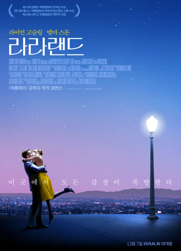 데이미언 셔젤 감독이 6년 동안 준비한 프로젝트로, 꿈과 현실의 충돌을 아름다운 음악과 영상으로 표현했습니다. 제89회 아카데미 시상식에서 감독상, 여우주연상, 음악상, 주제가상 등 6개 부문을 수상했습니다.
