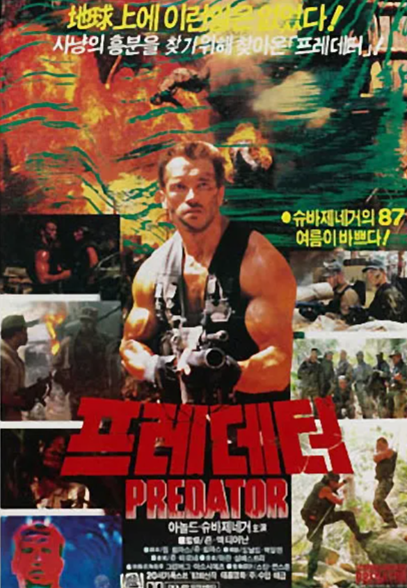 영화 <프레데터>(Predator)는 1987년에 개봉한 미국의 SF 액션 호러 영화입니다. 연출은 이후 <다이 하드>, <붉은 10월> 등으로 명성을 쌓은 존 맥티어넌 감독이 맡았으며, 각본은 짐 토머스와 존 토머스 형제가 썼습니다. 주요 출연진으로는 아널드 슈워제네거 님이 특수부대 팀을 이끄는 '더치 소령' 역을 맡았으며, 칼 웨더스, 엘피디아 칼리로, 빌 듀크, 제시 벤츄라 등 개성 강한 배우들이 팀원으로 출연하여 극에 무게감을 더했습니다. 빌런인 외계 사냥꾼 '프레데터'는 케빈 피터 할리 연기했습니다. 영화의 주요 배경은 남아메리카의 무성한 열대 정글이며, 이 밀폐된 환경이 외계 생명체의 추격으로부터 오는 긴장감을 극대화하는 역할을 합니다. 제작비는 1500만 달러에서 1800만 달러 사이였으며, 상영 시간은 109분입니다. 미국에서는 1987년 6월 12일에, 한국에서는 같은 해 7월 17일에 개봉했습니다. 영화는 잔인한 장면이 포함되어 있어 국내에서는 1987년 개봉 당시 '청소년 관람불가' 등급을 받았지만, 이후 재심의를 통해 15세 이상 관람가(2021년)로 조정되었습니다. 이 영화는 이후 <프레데터 2>, <프레데터스>, <더 프레데터>, <프레이> 등의 속편과 스핀오프 시리즈로 이어지며 '프레데터 유니버스'를 구축하는 시초가 되었습니다.
